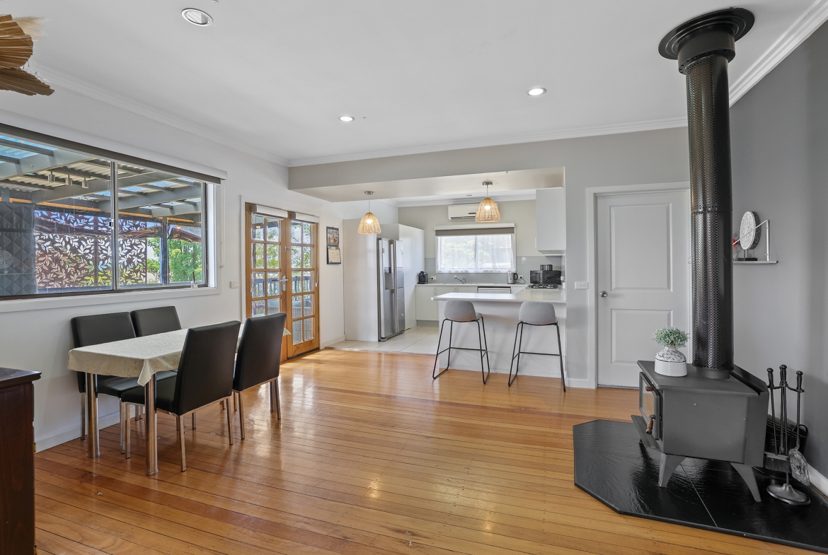 At the heart of the home is a light-filled open-plan living zone, enhanced by timber floors, a modern kitchen, and a stunning ambient winter fireplace feature. Split-system cooling and ducted heating ensure year-round comfort, creating a warm and inviting space for everyday living.
