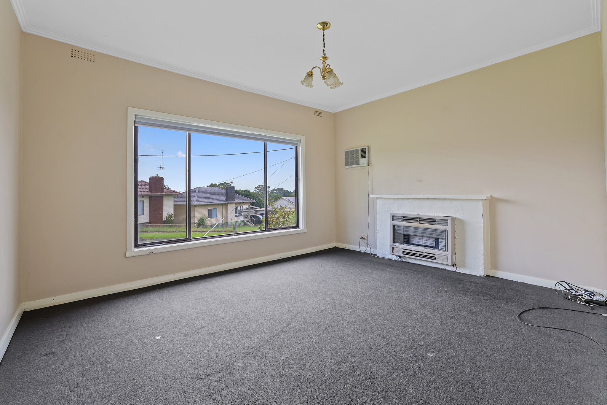 The existing home includes 3 bedrooms, 1 bathroom, kitchen/dining, and separate lounge, with gas heating and wall-mounted cooling providing basic comfort.
