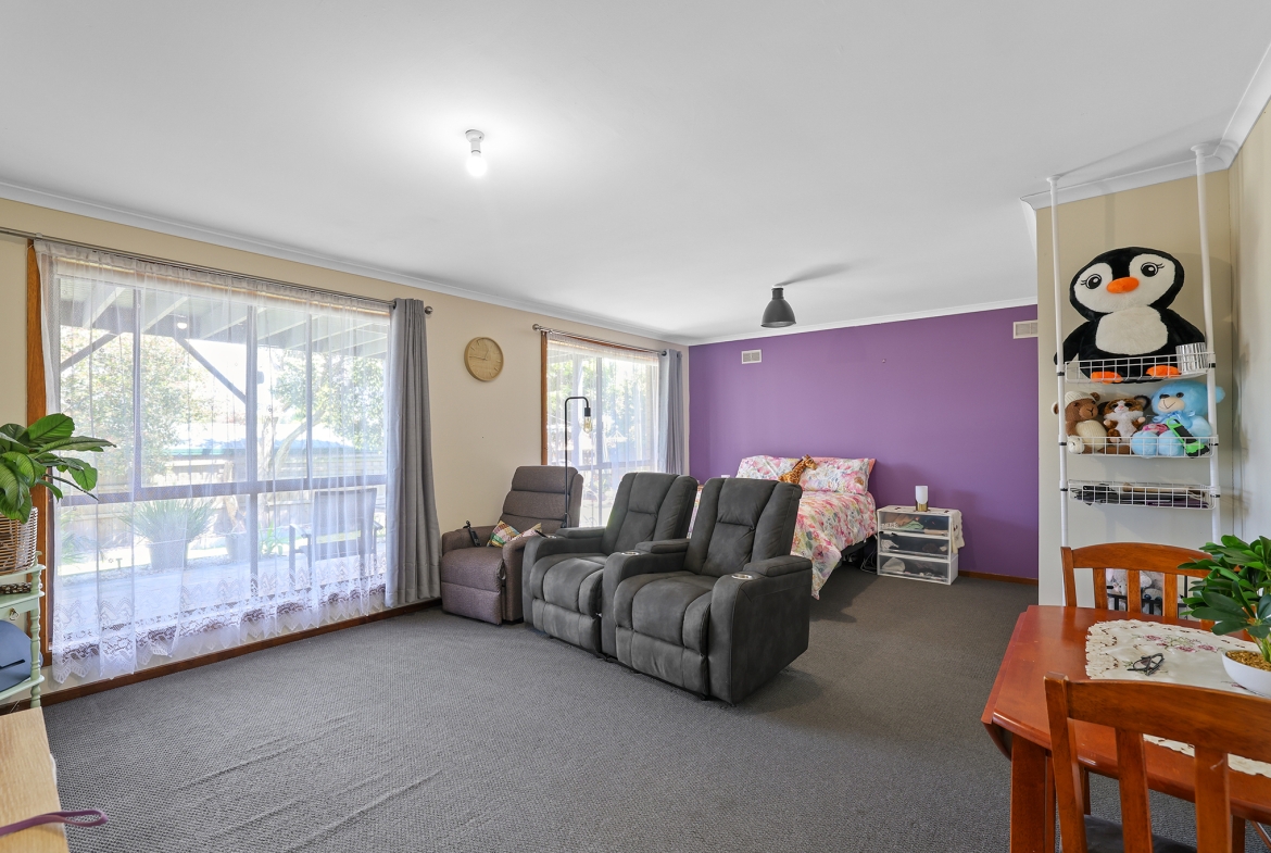 A large carport with rear parking and a wide driveway provide ample space for multiple cars, a caravan, or a trailer.