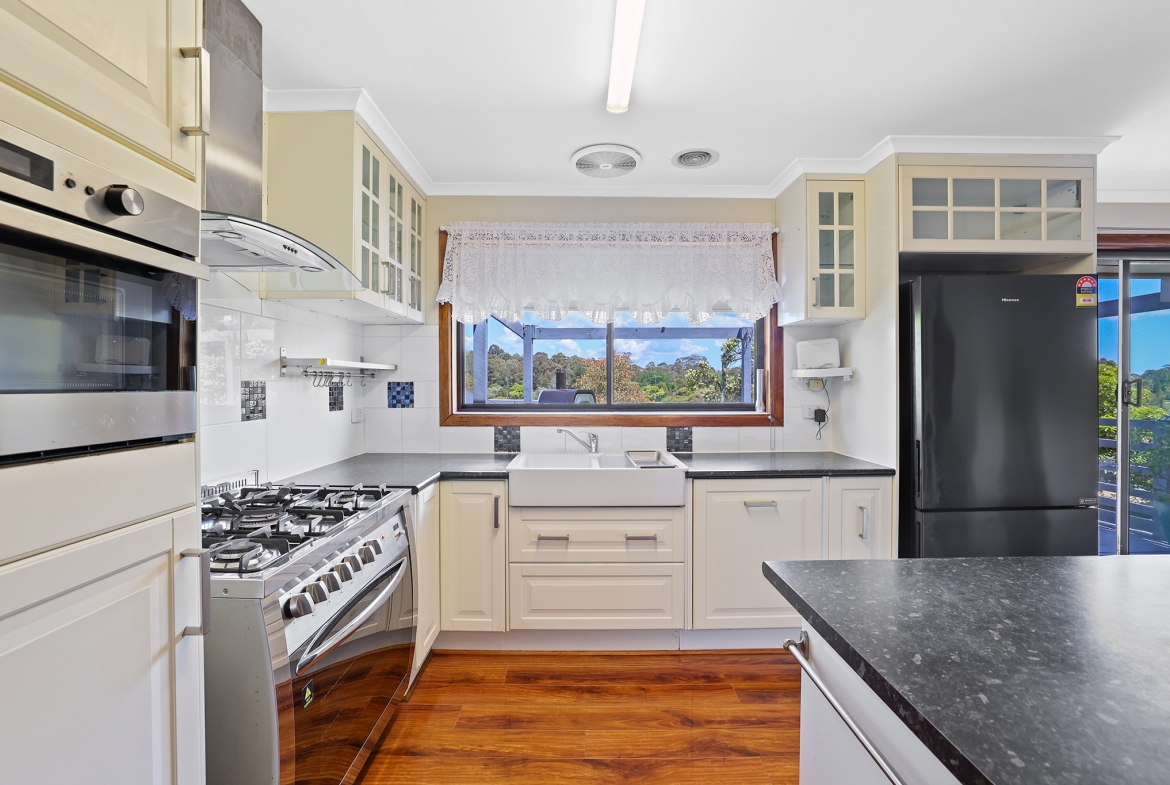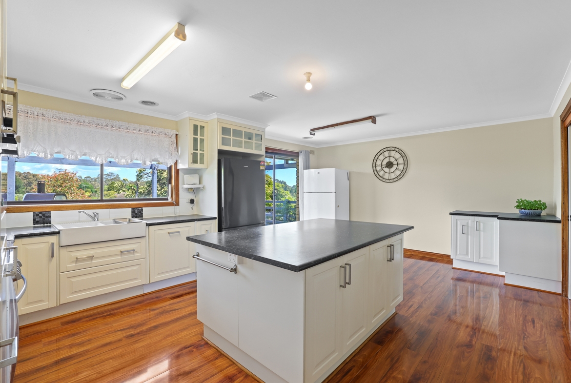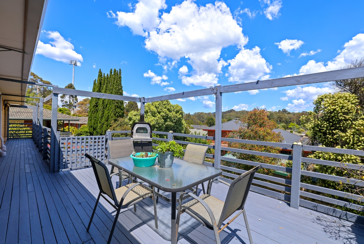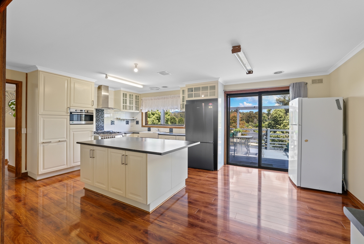 The top level features three bedrooms, the main bathroom, lounge, and a modern renovated kitchen with plenty of bench space, flowing to a decked entertaining area with scenic views.